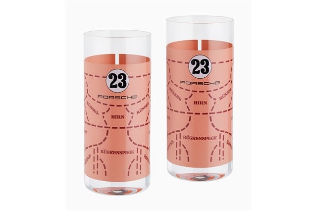 Auf die Ikone – mit diesem Set aus 2 hochwertigen Longdrink-Gläsern schmecken Cocktails gleich doppelt gut. Das Design ist an die legendäre Lackierung der Porsche 917 "Sau" angelehnt und von Studio F. A. Porsche entworfen.